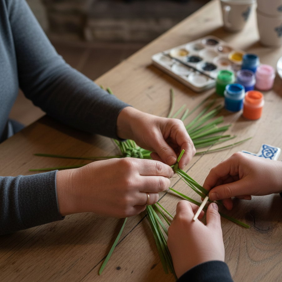 An over-the-shoulder, close-up shot of two people crafting on a rustic wooden table. On the left, a person’s hands are intricately weaving a traditional St Brigid’s Cross using long, green-gold rushes. On the right, another person uses a fine paintbrush to apply blue and gold detail to a white ceramic Celtic cross featuring raised interlaced patterns. Small pots of paint and a jar of water sit between them. In the soft-focus background, a warm fire glows in a stone fireplace, and religious icons are visible